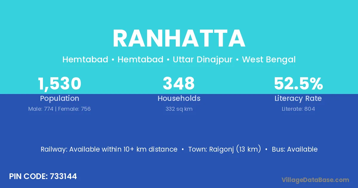 According to Census 2011 information, the village code of Ranhatta village is 733144.