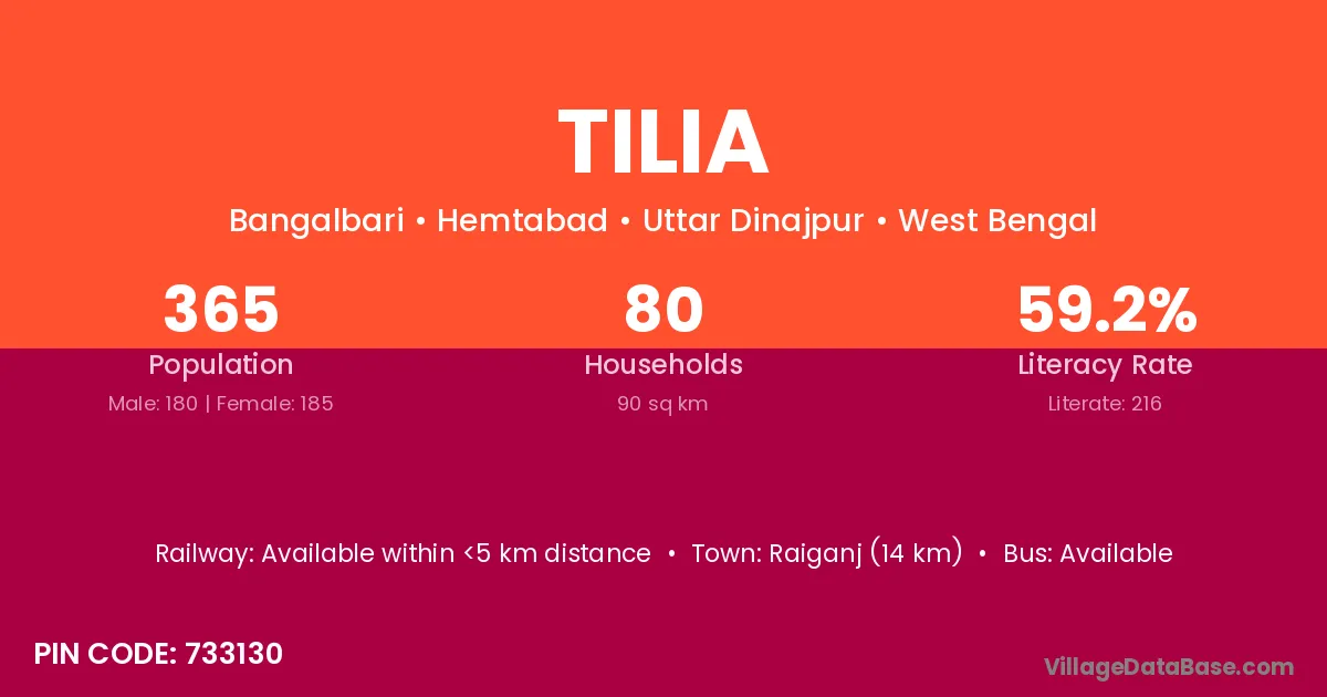 Raiganj (14 km) is the nearest town to Tilia village for major economic activities and is located approximately 14 km away.