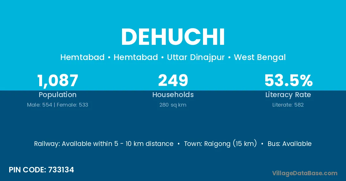 Raigong (15 km) is the nearest town to Dehuchi village for major economic activities and is located approximately 15 km away.