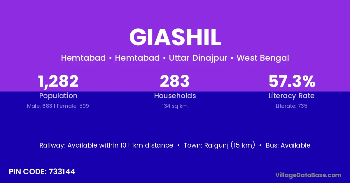 Raigunj (15 km) is the nearest town to Giashil village for major economic activities and is located approximately 15 km away.