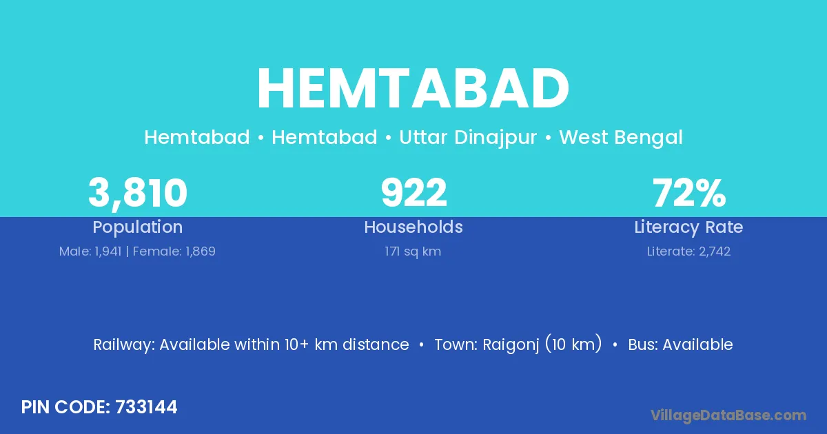 Hemtabad village is located in the Hemtabad Subdivision of the Uttar Dinajpur district in West Bengal.