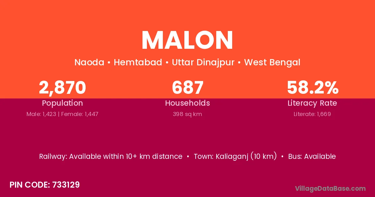 Kaliaganj (10 km) is the nearest town to Malon village for major economic activities and is located approximately 10 km away.