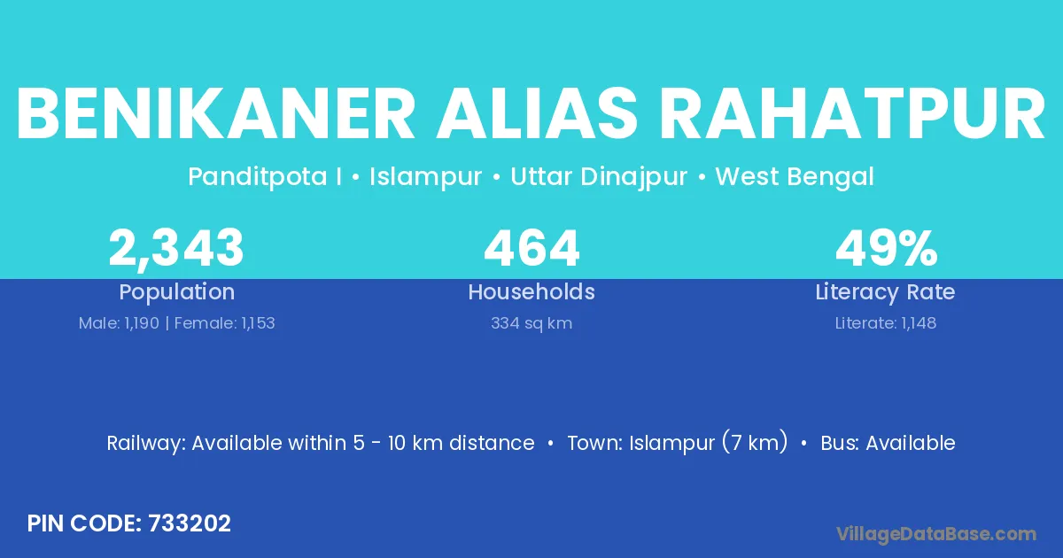 Benikaner Alias Rahatpur village is located in the Islampur Subdivision of the Uttar Dinajpur district in West Bengal.