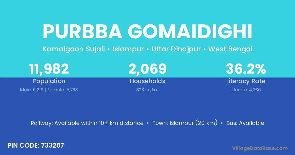 Purbba Gomaidighi village has a total population of 11,982 people, of which 6,219 are males and 5,763 are females.
