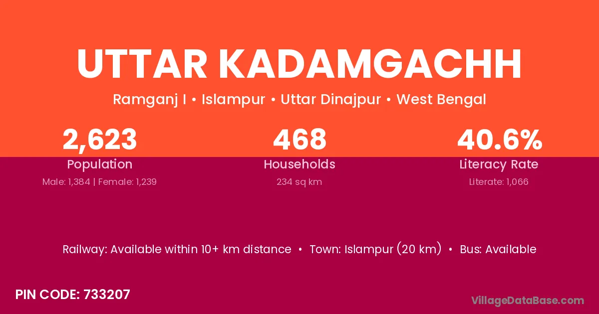 Islampur (20 km) is the nearest town to Uttar Kadamgachh village for major economic activities and is located approximately 20 km away.