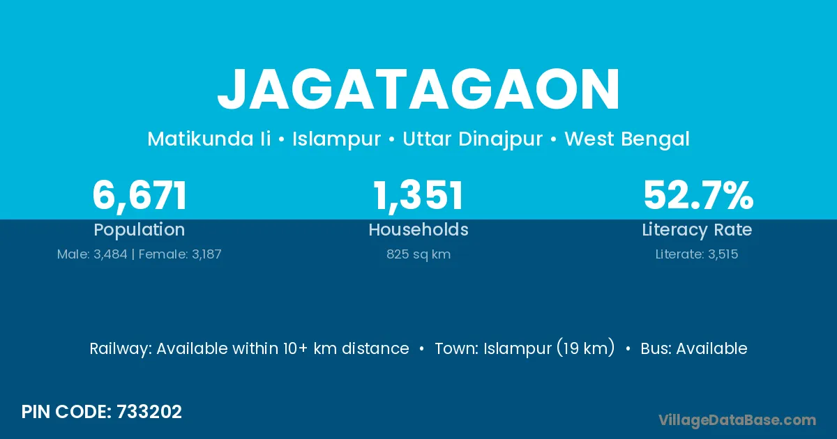 Islampur (19 km) is the nearest town to Jagatagaon village for major economic activities and is located approximately 19 km away.