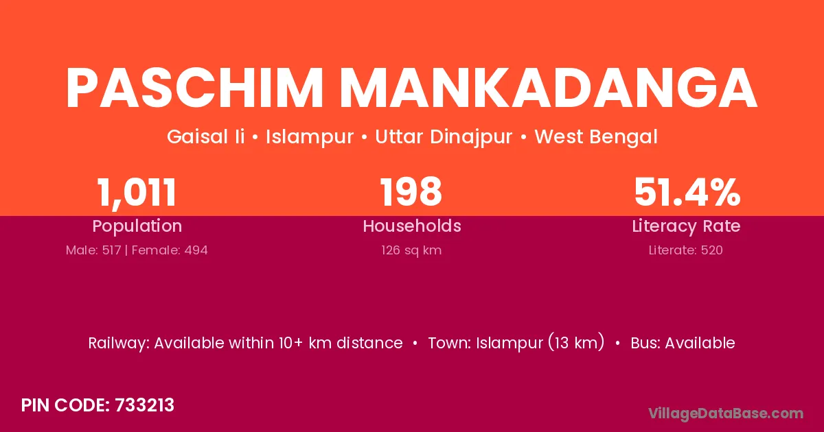 Paschim Mankadanga village has a total population of 1,011 people, of which 517 are males and 494 are females.