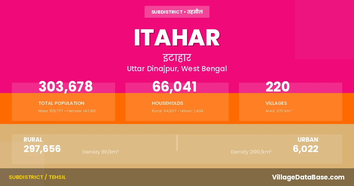 According to the 2011 census The total area of Itahar Subdivision is 370 km², with a population of 303678 people. The population density is 821 inhabitants per square kilometre, and there are approximately 66041 houses in the sub district.