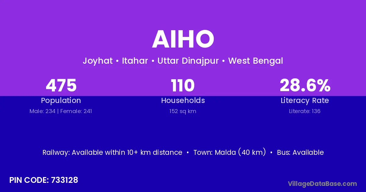 Malda (40 km) is the nearest town to Aiho village for major economic activities and is located approximately 40 km away.