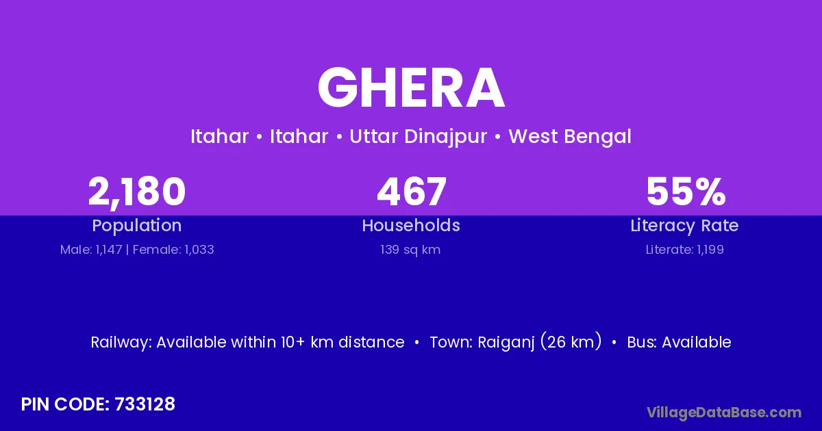 Raiganj (26 km) is the nearest town to Ghera village for major economic activities and is located approximately 26 km away.