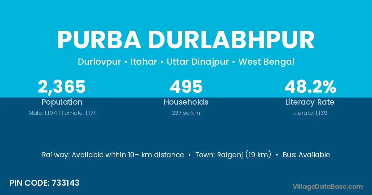 Raiganj (19 km) is the nearest town to Purba Durlabhpur village for major economic activities and is located approximately 19 km away.