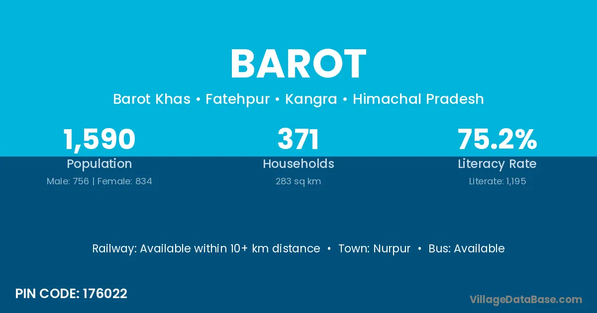 The literacy rate of Barot village is 54.14%. Male literacy stands at 55.26% and female literacy at 52.90%.