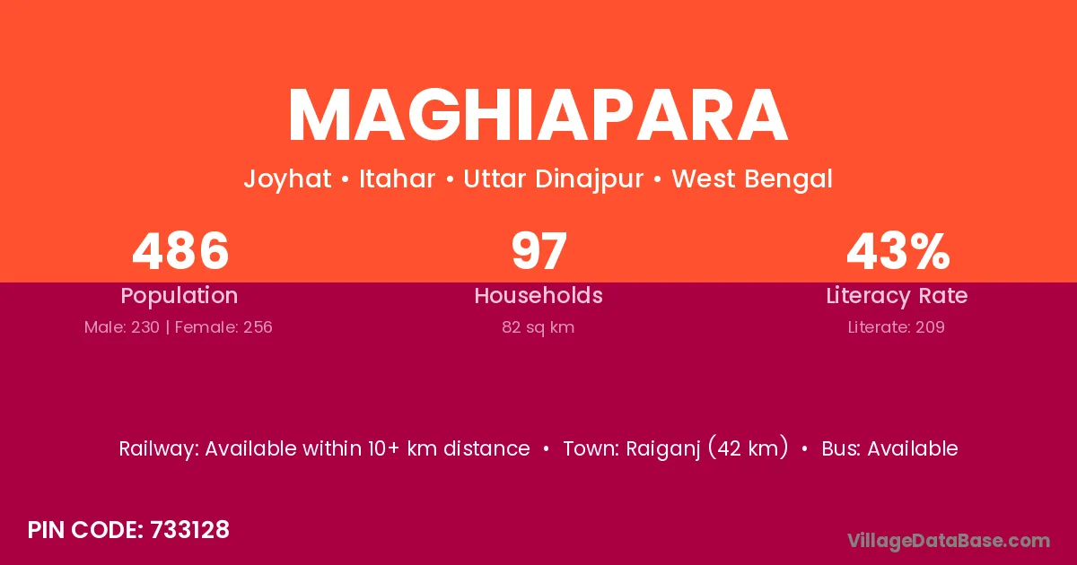 Raiganj (42 km) is the nearest town to Maghiapara village for major economic activities and is located approximately 42 km away.