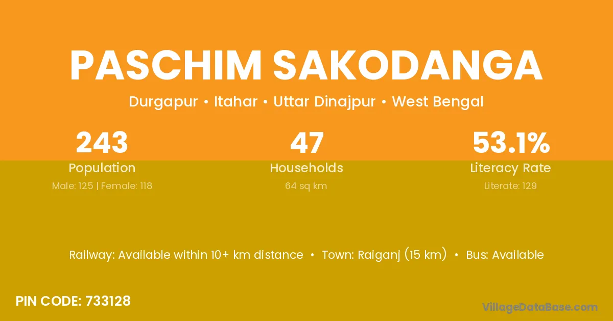 Raiganj (15 km) is the nearest town to Paschim Sakodanga village for major economic activities and is located approximately 15 km away.