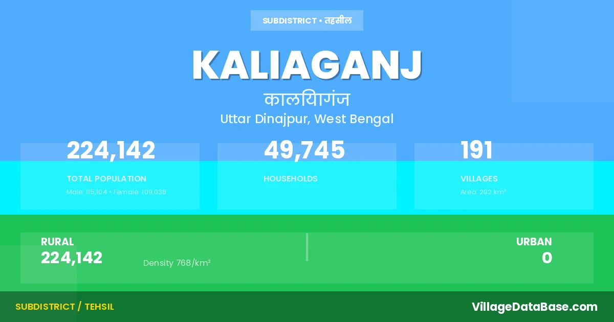 According to the 2011 census The total area of Kaliaganj Subdivision is 292 km², with a population of 224142 people. The population density is 768 inhabitants per square kilometre, and there are approximately 49745 houses in the sub district.