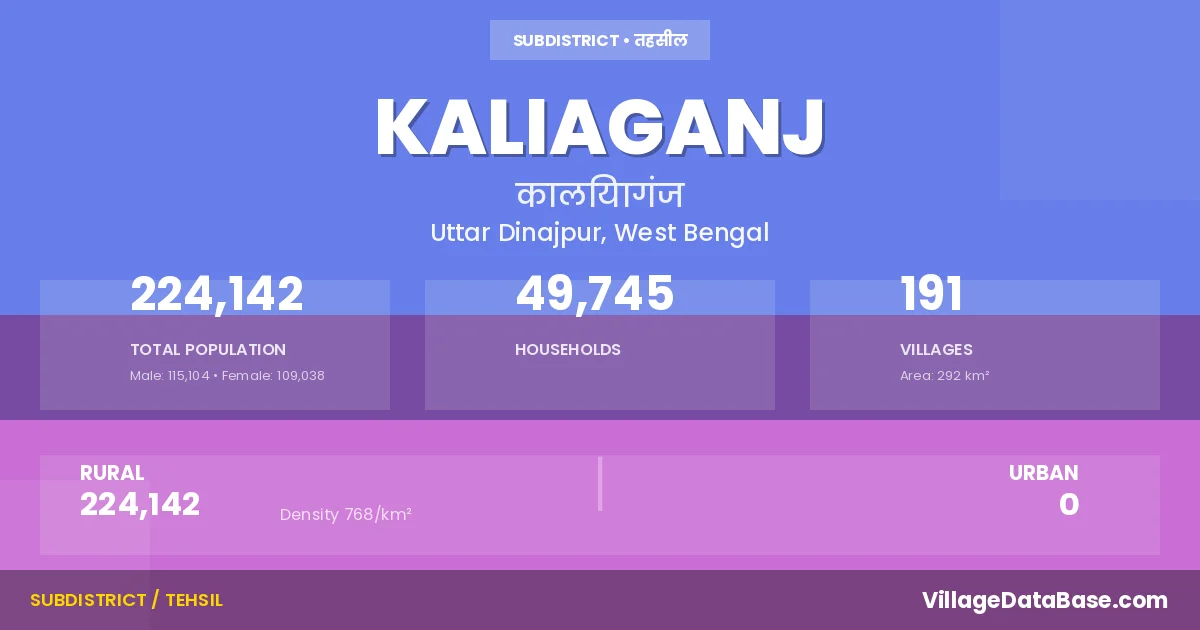 According to the 2011 census The total area of Kaliaganj Subdivision is 292 km², with a population of 224142 people. The population density is 768 inhabitants per square kilometre, and there are approximately 49745 houses in the sub district.