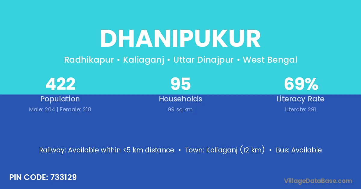 Kaliaganj (12 km) is the nearest town to Dhanipukur village for major economic activities and is located approximately 12 km away.
