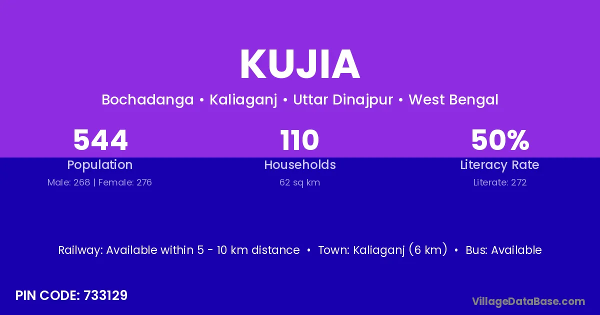 Kaliaganj (6 km) is the nearest town to Kujia village for major economic activities and is located approximately 6 km away.