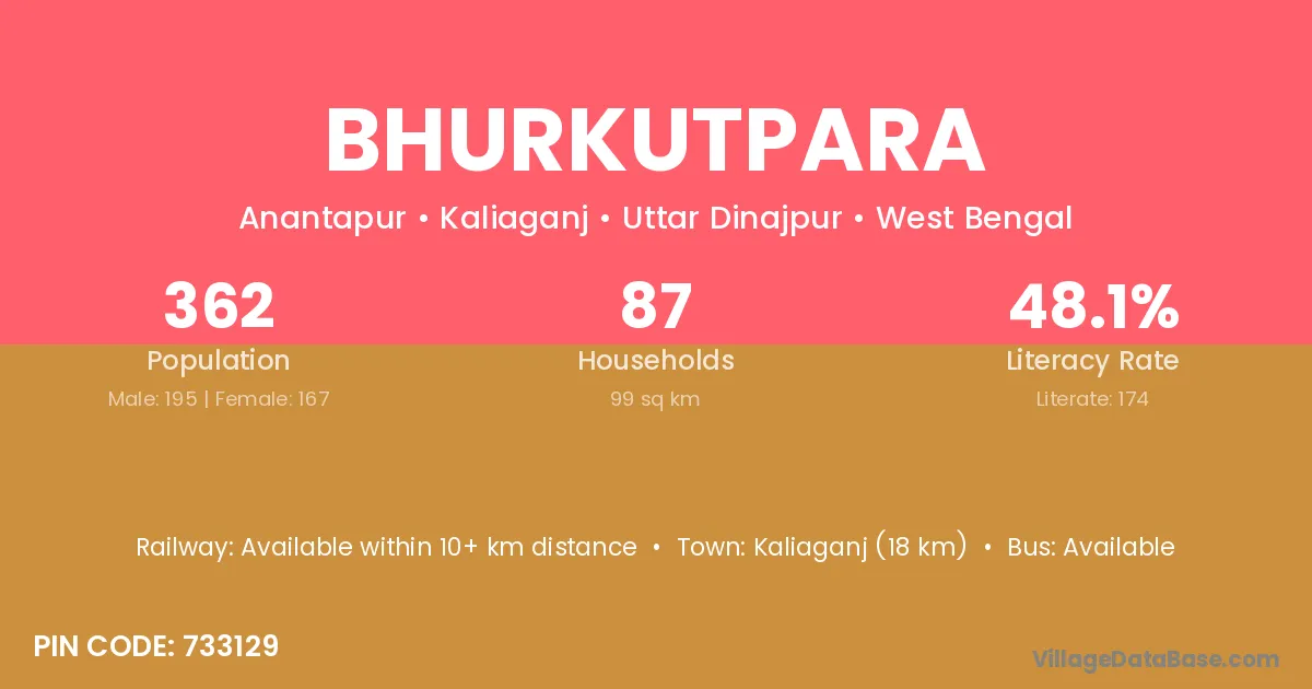 Kaliaganj (18 km) is the nearest town to Bhurkutpara village for major economic activities and is located approximately 18 km away.