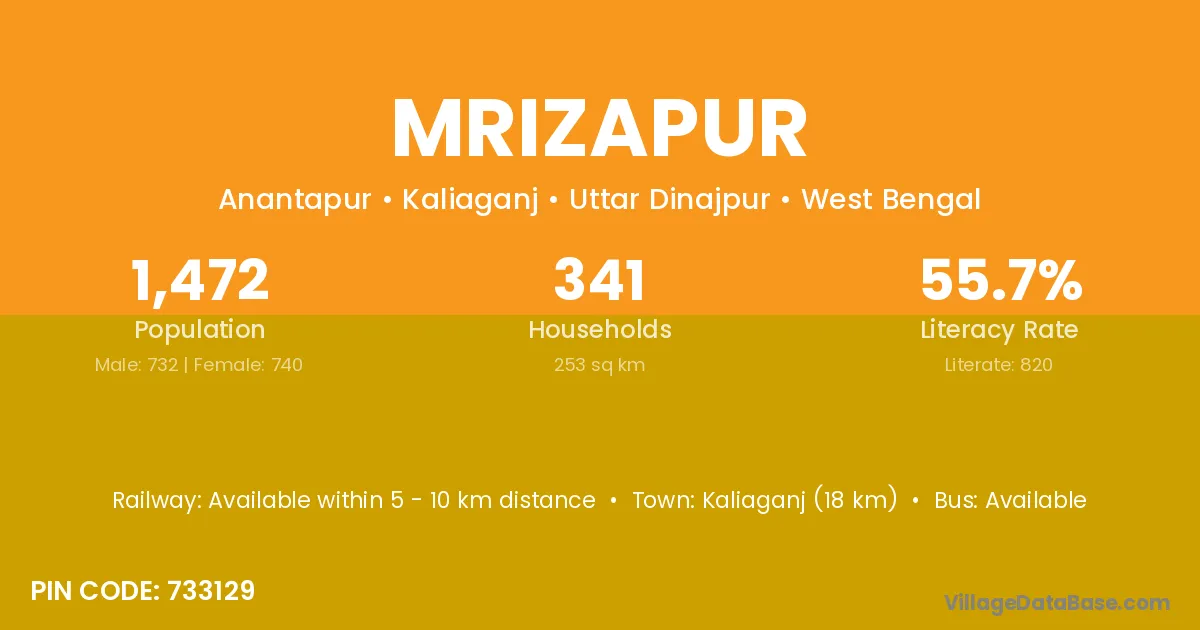 Kaliaganj (18 km) is the nearest town to Mrizapur village for major economic activities and is located approximately 18 km away.
