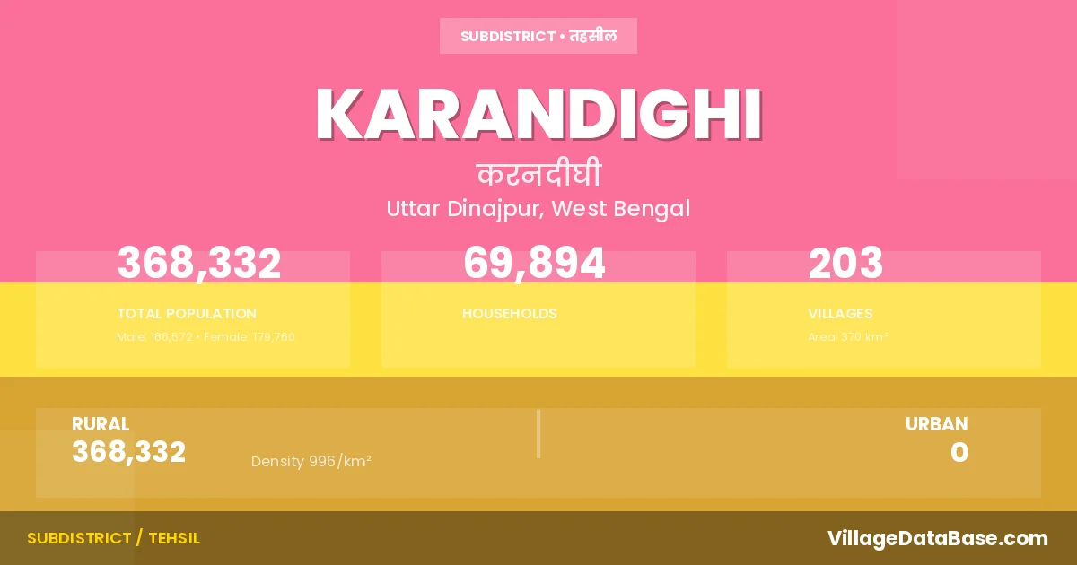 According to the 2011 census The total area of Karandighi Subdivision is 370 km², with a population of 368332 people. The population density is 996 inhabitants per square kilometre, and there are approximately 69894 houses in the sub district.