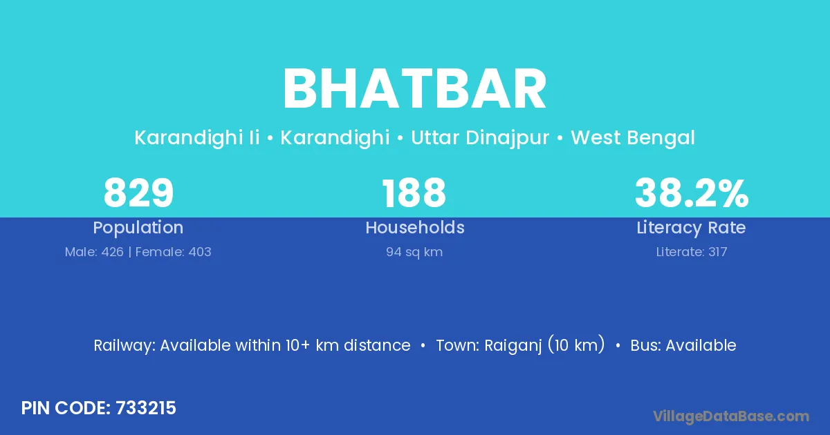 Bhatbar village is located in the Karandighi Subdivision of the Uttar Dinajpur district in West Bengal.
