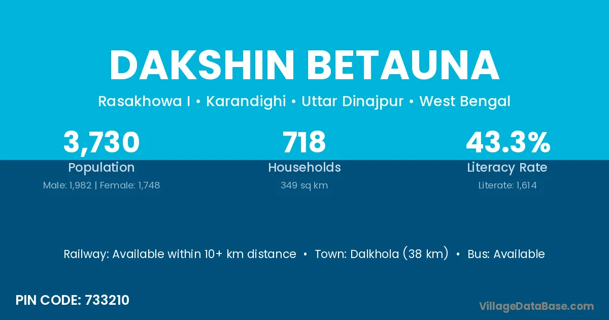Dalkhola (38 km) is the nearest town to Dakshin Betauna village for major economic activities and is located approximately 38 km away.
