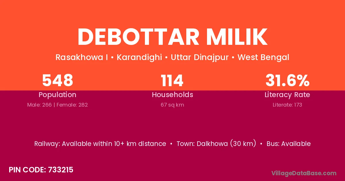 Dalkhowa (30 km) is the nearest town to Debottar Milik village for major economic activities and is located approximately 30 km away.