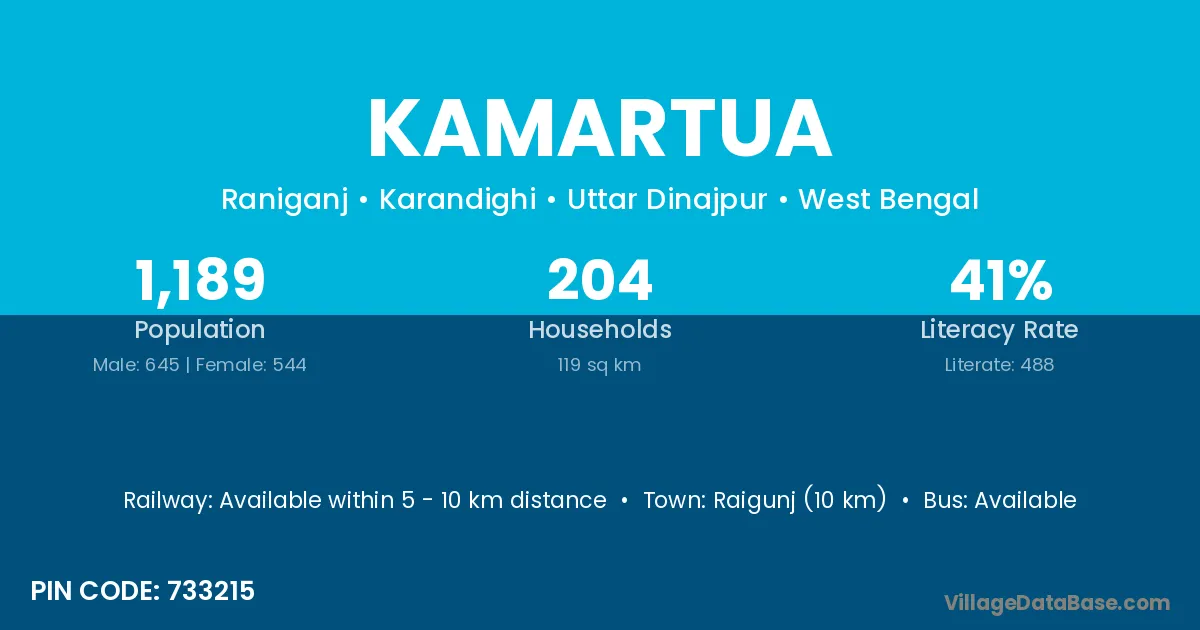 Raigunj (10 km) is the nearest town to Kamartua village for major economic activities and is located approximately 10 km away.