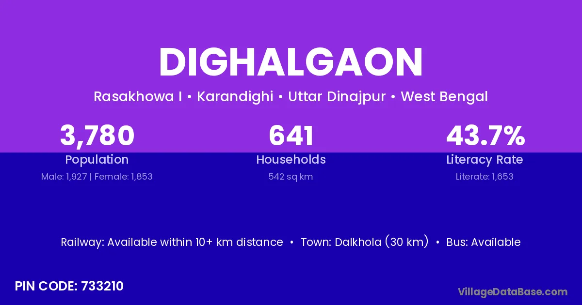 Dalkhola (30 km) is the nearest town to Dighalgaon village for major economic activities and is located approximately 30 km away.