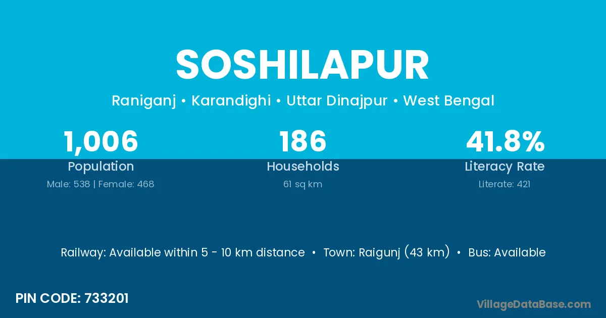 Raigunj (43 km) is the nearest town to Soshilapur village for major economic activities and is located approximately 43 km away.