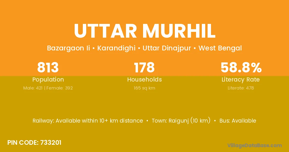 Raigunj (10 km) is the nearest town to Uttar Murhil village for major economic activities and is located approximately 10 km away.
