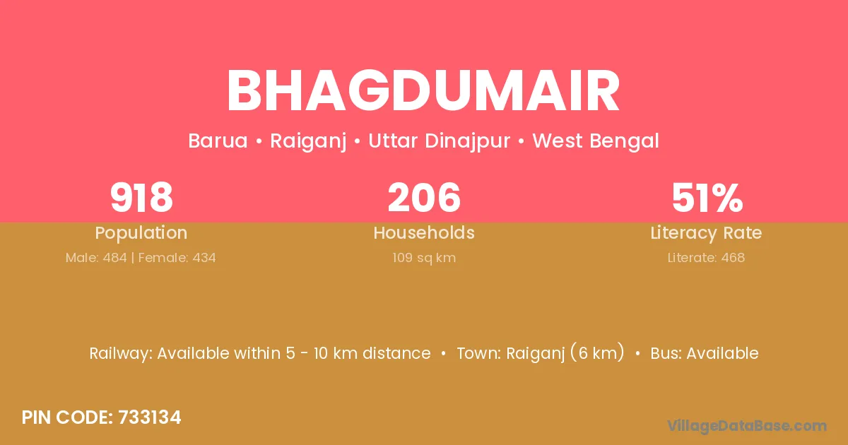 Raiganj (6 km) is the nearest town to Bhagdumair village for major economic activities and is located approximately 6 km away.