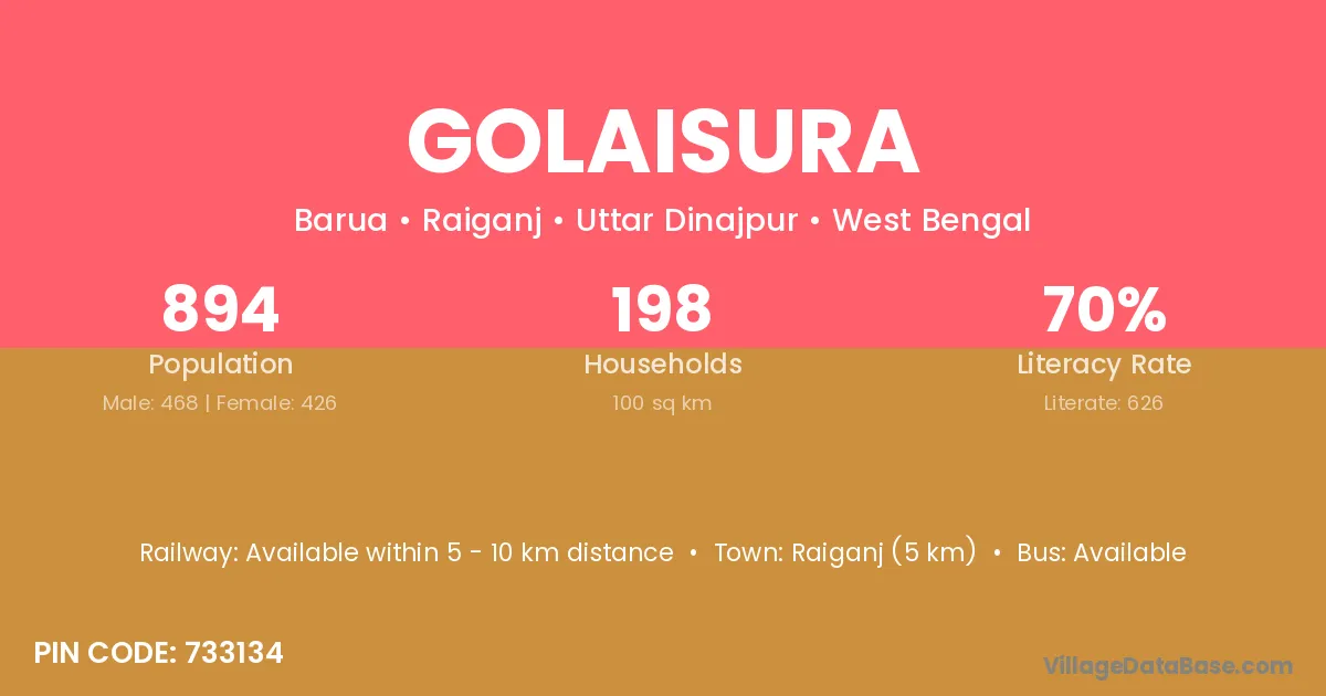 Raiganj (5 km) is the nearest town to Golaisura village for major economic activities and is located approximately 5 km away.