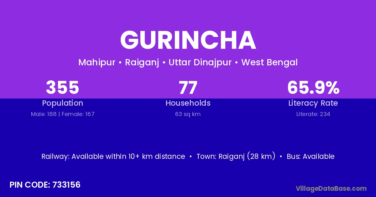 Raiganj (28 km) is the nearest town to Gurincha village for major economic activities and is located approximately 28 km away.