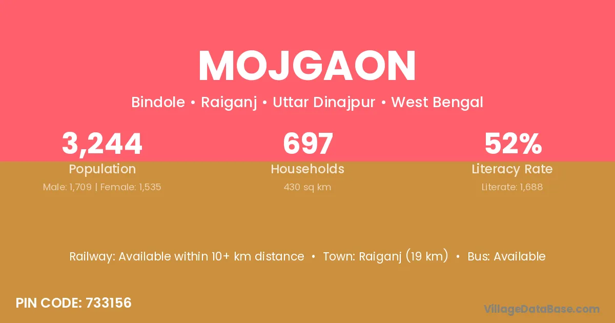 Raiganj (19 km) is the nearest town to Mojgaon village for major economic activities and is located approximately 19 km away.