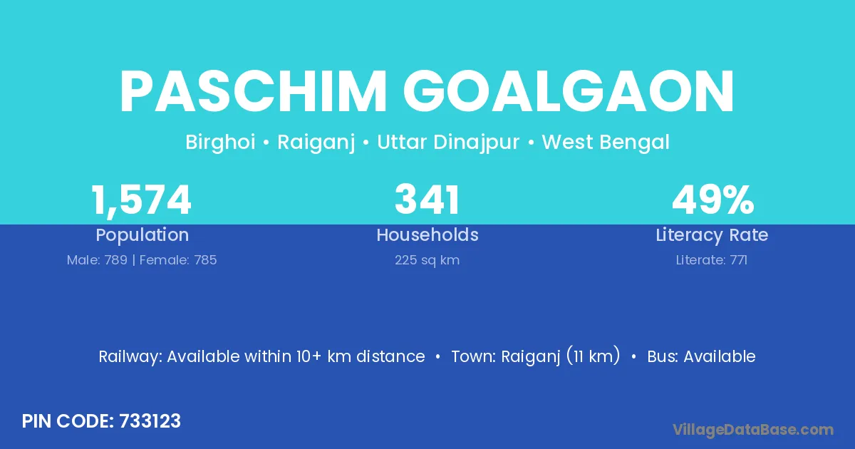 Raiganj (11 km) is the nearest town to Paschim Goalgaon village for major economic activities and is located approximately 11 km away.