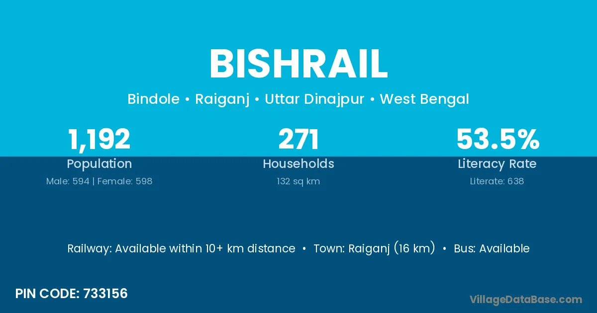 Raiganj (16 km) is the nearest town to Bishrail village for major economic activities and is located approximately 16 km away.