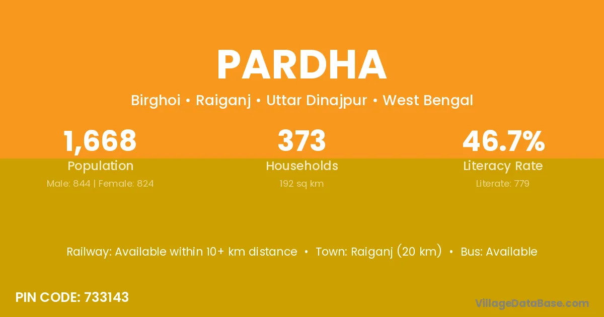 Raiganj (20 km) is the nearest town to Pardha village for major economic activities and is located approximately 20 km away.