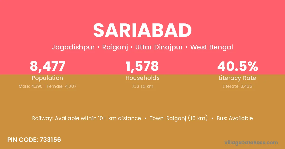Raiganj (16 km) is the nearest town to Sariabad village for major economic activities and is located approximately 16 km away.