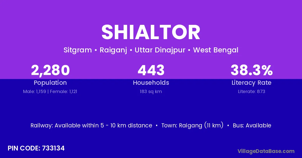 Raigang (11 km) is the nearest town to Shialtor village for major economic activities and is located approximately 11 km away.