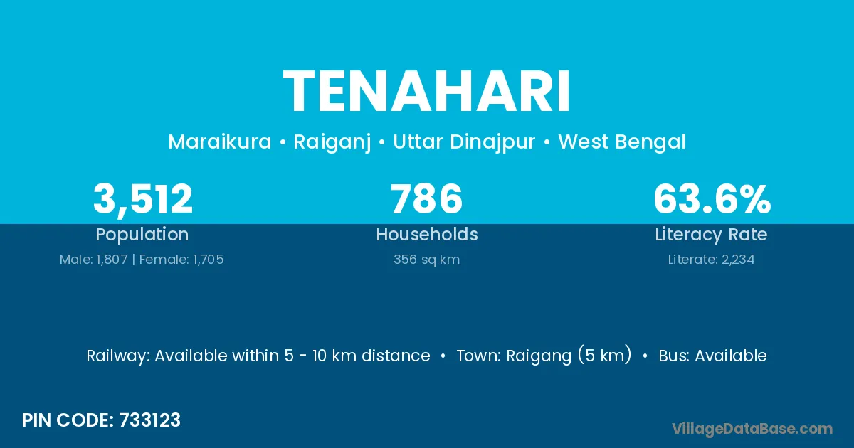 Raigang (5 km) is the nearest town to Tenahari village for major economic activities and is located approximately 5 km away.